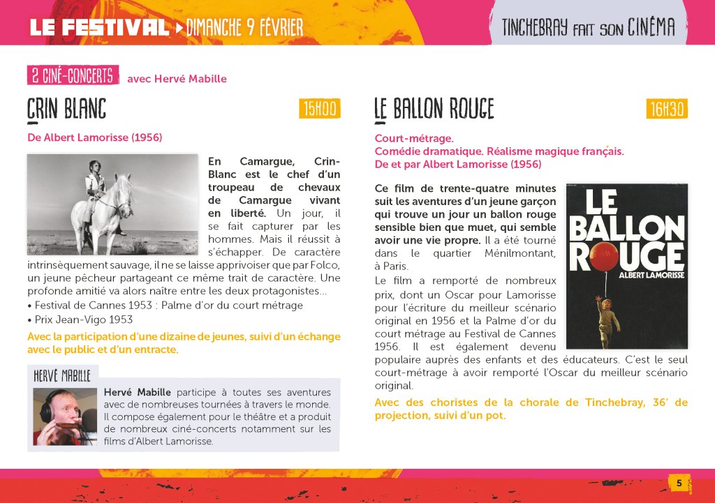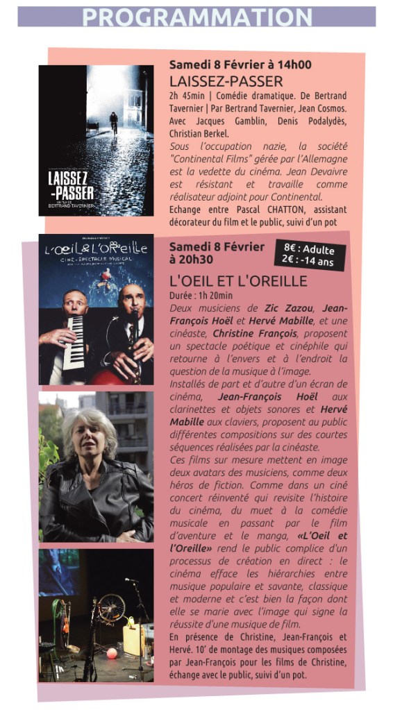 | – 14h00 : Laissez-Passer – 20h30 : L’Oeil et l’Oreille | – 15h00 : Ciné-concert « Crin Blanc » – 16h30 : Ciné-concert « Le Ballon Rouge » |